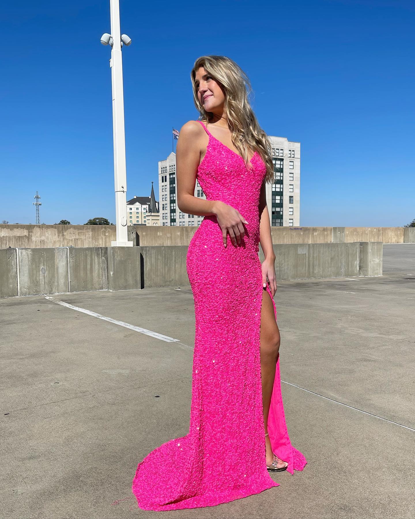 Romantic Mermaid V Neck Fuchsia Sequin Long Prom Evening Dresses with Side Slit
