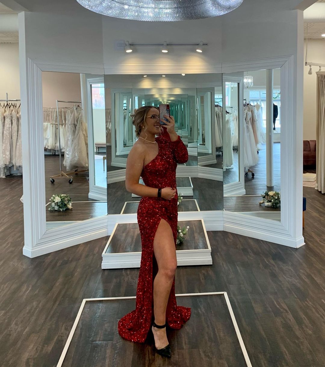 Glitter Mermaid One Shoulder Long Sleeve Sequin Long Prom Dresses with Side Slit