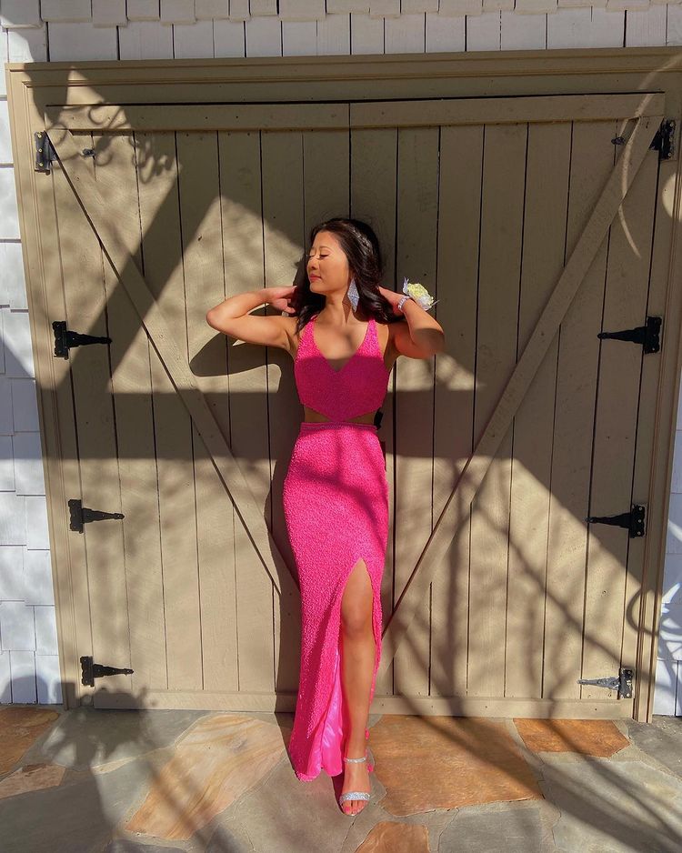 Gorgeous Mermaid V Neck Hot Pink Sequin Long Prom Evening Dresses