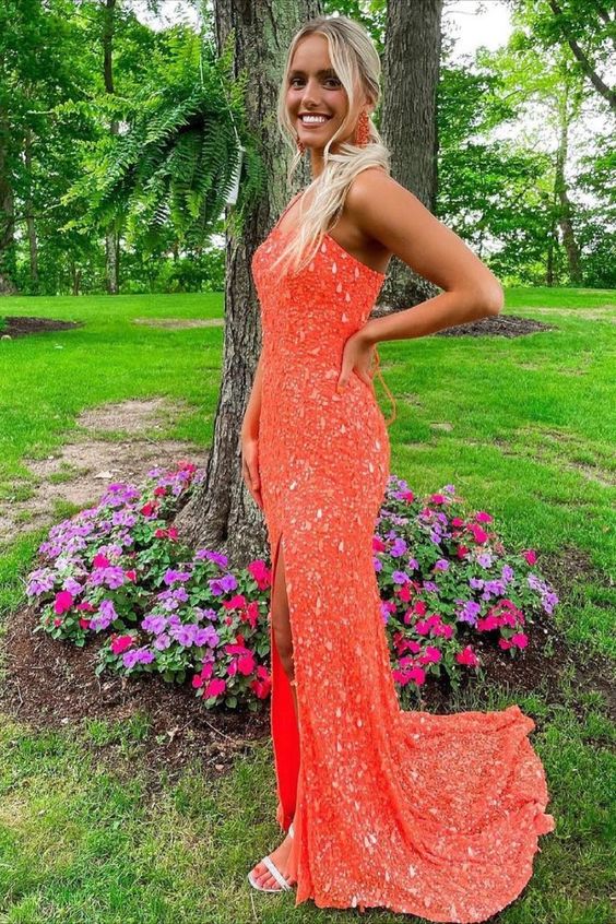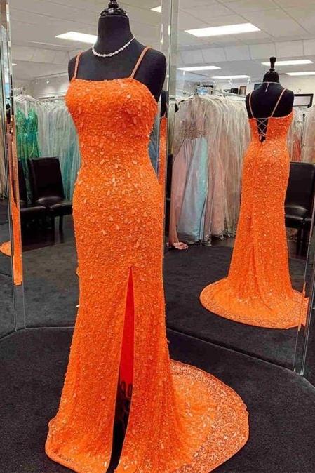 Cute Mermaid Straps Orange Sequins Long Prom Dresses with Slit