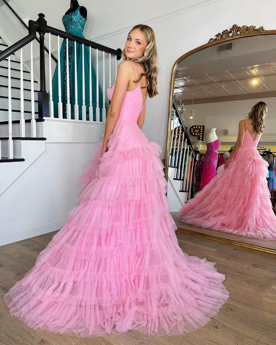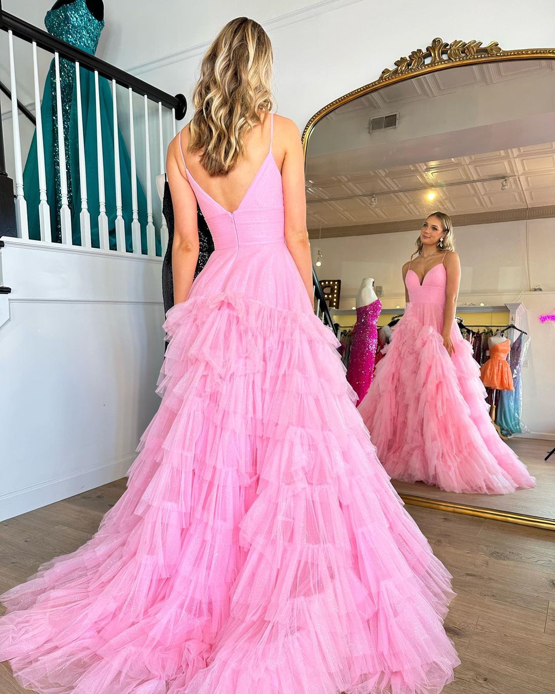 Cute A Line V Neck Pink Tulle Prom Dresses