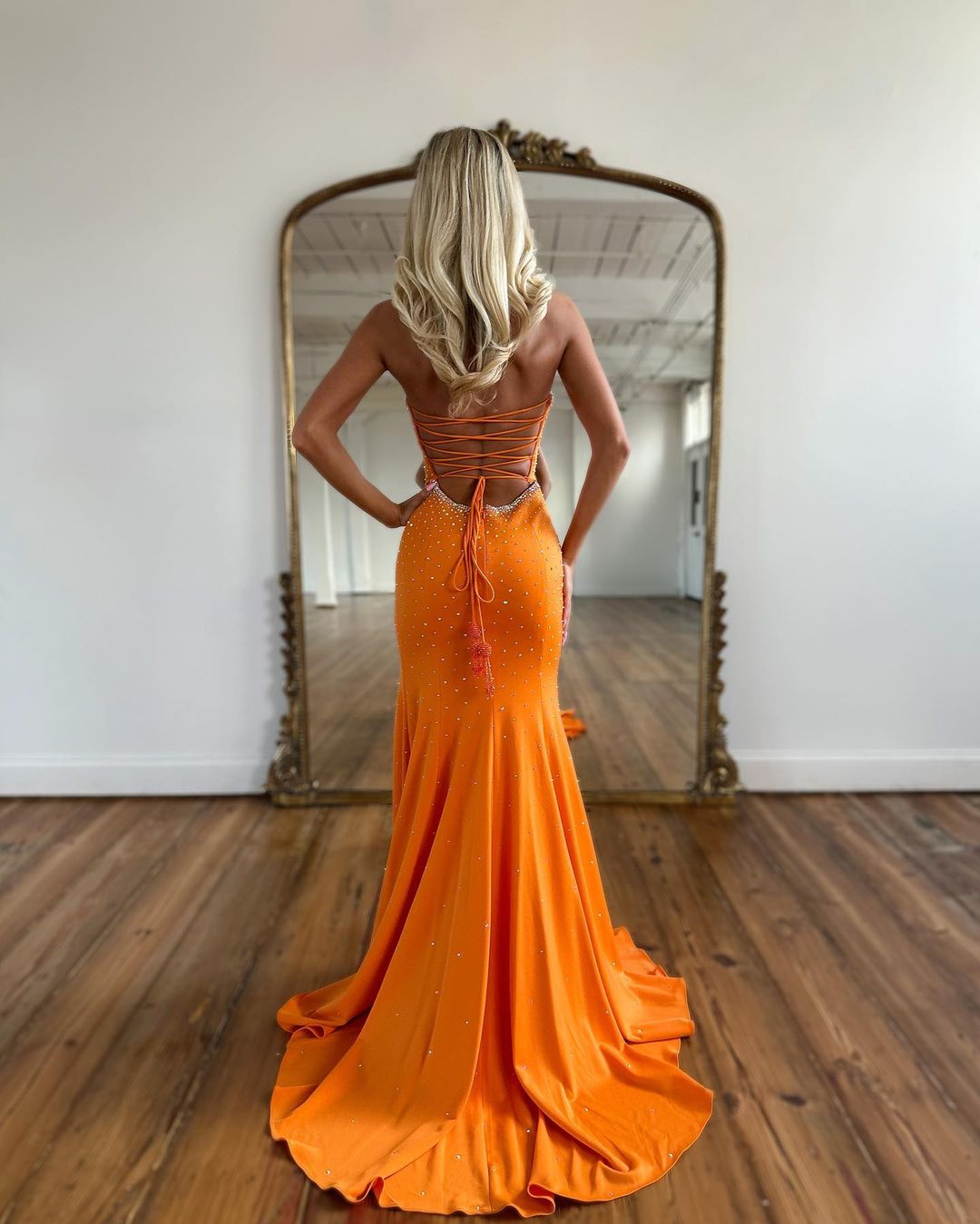 Cute Mermaid Sweetheart Orange Satin Long Prom Dresses with Beading