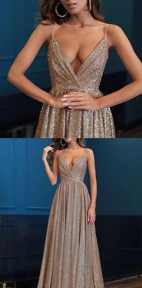 Sexy A Line V Neck Sequins Prom Dresses, Gorgeous Spaghetti Straps Formal Dresses, Evening Dresses, V Neck Graduation Dresses