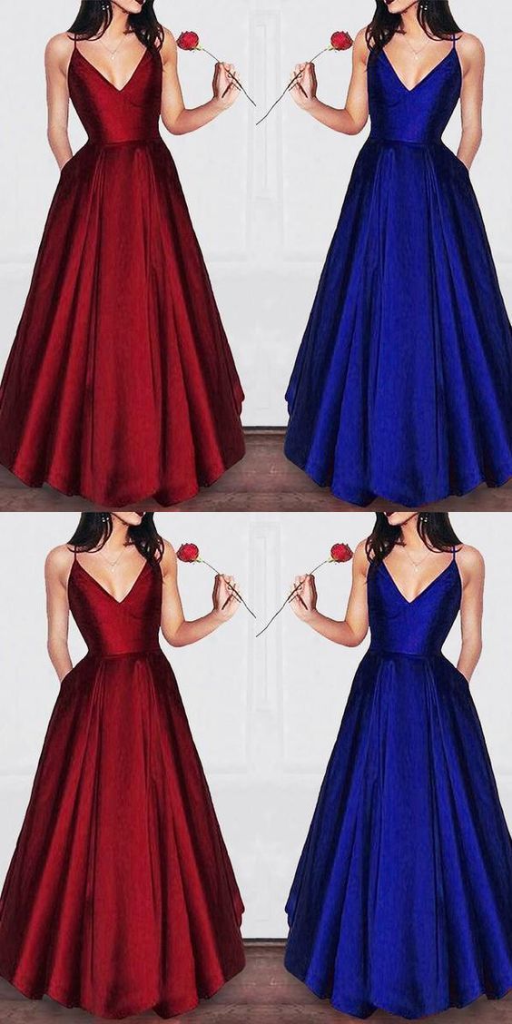 A-line V-neck Spaghetti Strap Burgundy Prom Dresses Long Evening Gowns