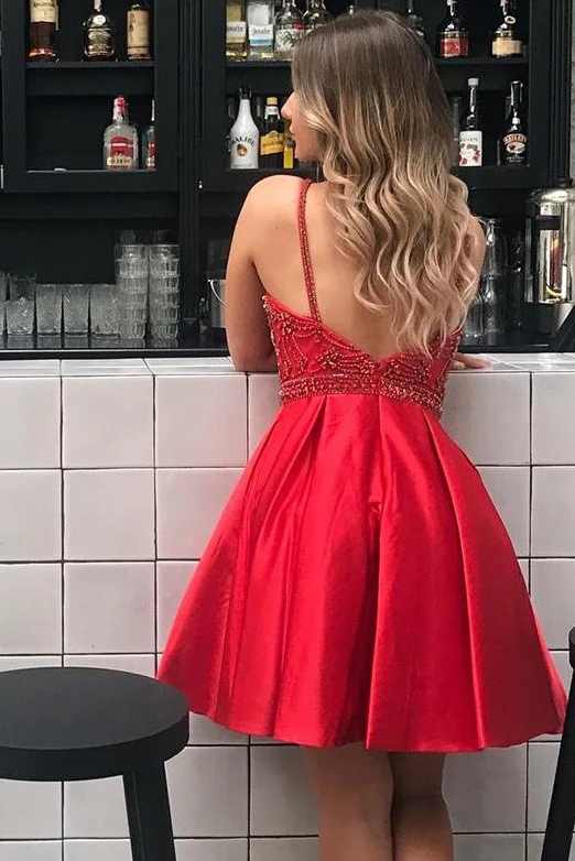 Chic A Line Stylish Halter Red Short Homecoming Dresses with Beading