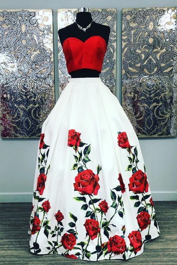 Two Piece Sweetheart Open Back Red Floral Printed Prom Dresses,Evening Party Dresses with Pockets