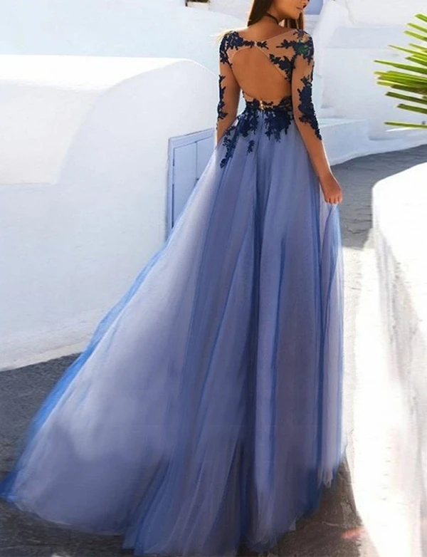 A-Line Long Sleeves Open Back Dark Blue Long Prom Dress