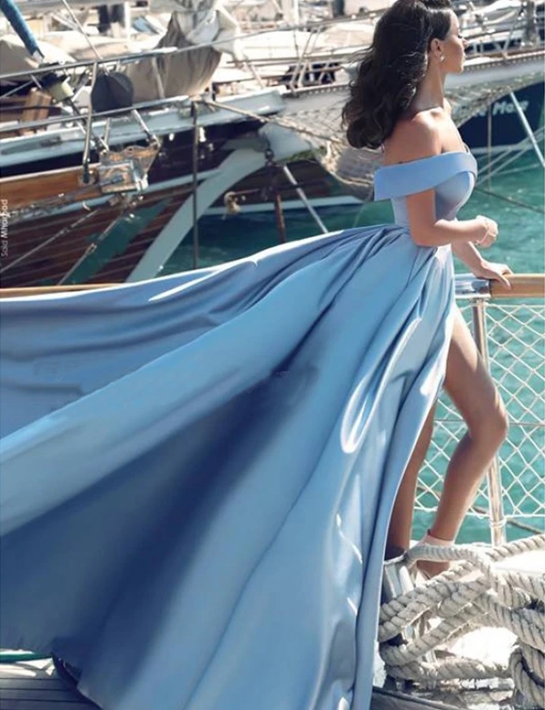 Charming A-Line Off the Shoulder Blue Prom Dress With Split