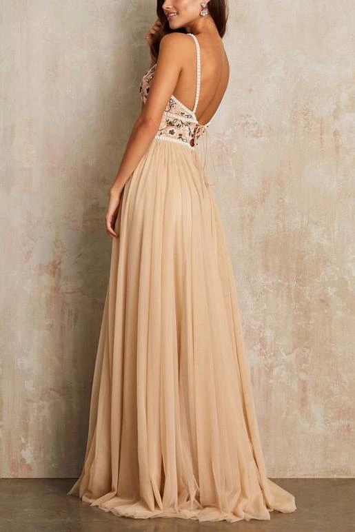 Unique Embroidered Backless Lace Up Tulle A Line Long Evening Prom Dresses