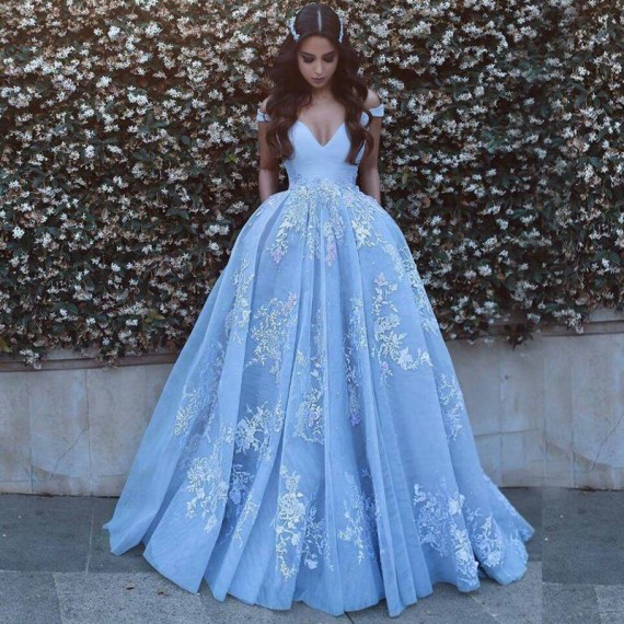Ball Gown Off-the-Shoulder Sweep Train Blue Prom Dress with Pockets Appliques