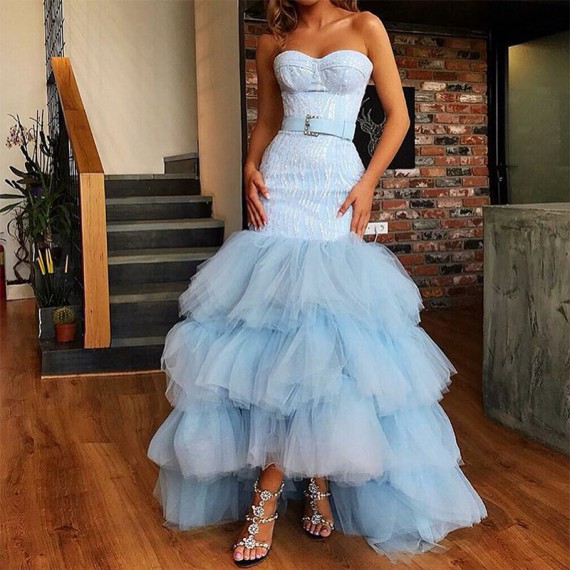 Mermaid Sweetheart High Low Light Blue Tiered Tulle Prom Dress