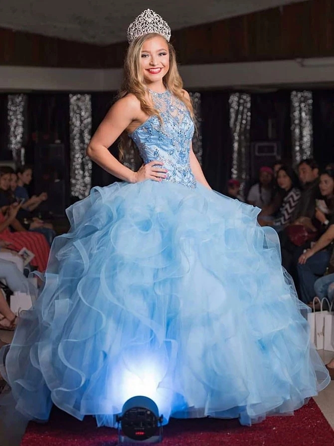 Jewel Neck Tulle Ball Gown Quinceanera Dresses With Beads
