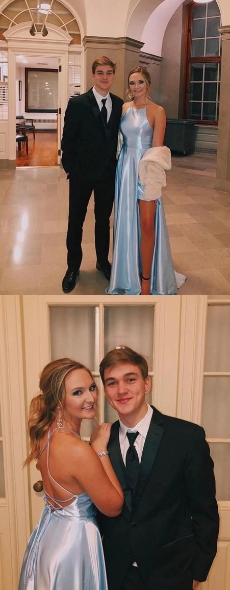 Simple Halter Blue Prom Dress with Split Satin Long Sleeveless Party Dress