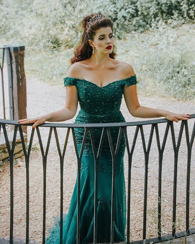 Stylish Mermaid Off the Shoulder Green Lace Long Prom Evening Dresses with Appliques
