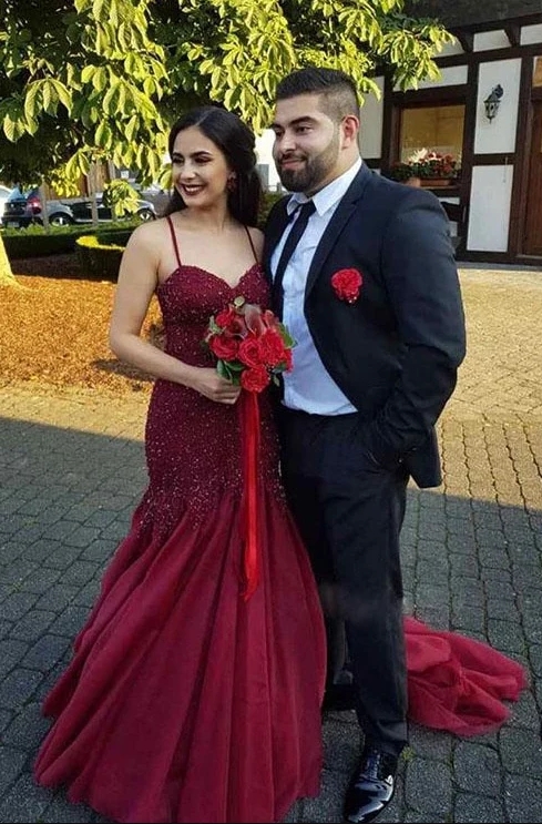 Sexy Mermaid Spaghetti Straps Beads Lace Burgundy Mermaid Prom Dress