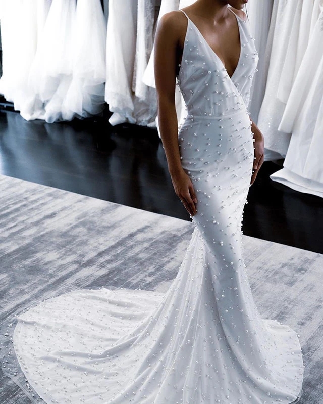 Marvelous Mermaid V Neck Wedding Dresses with Pearls