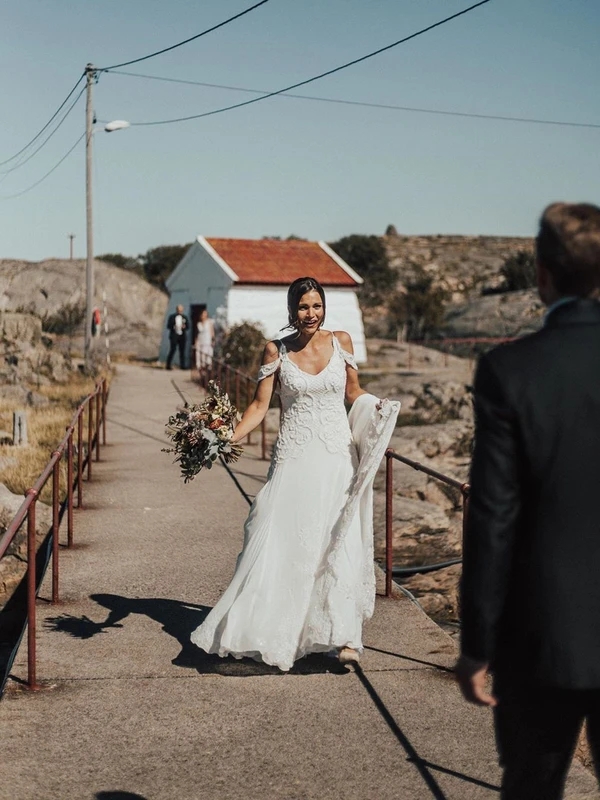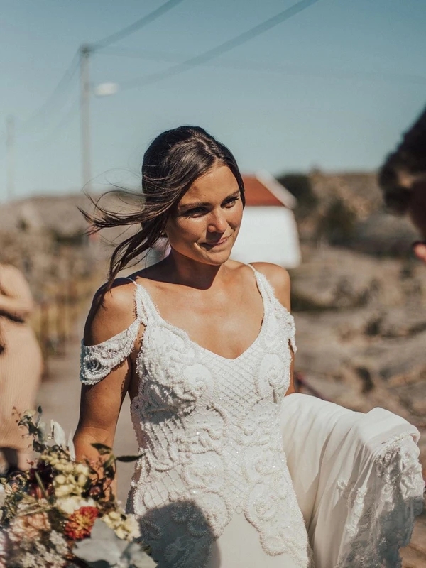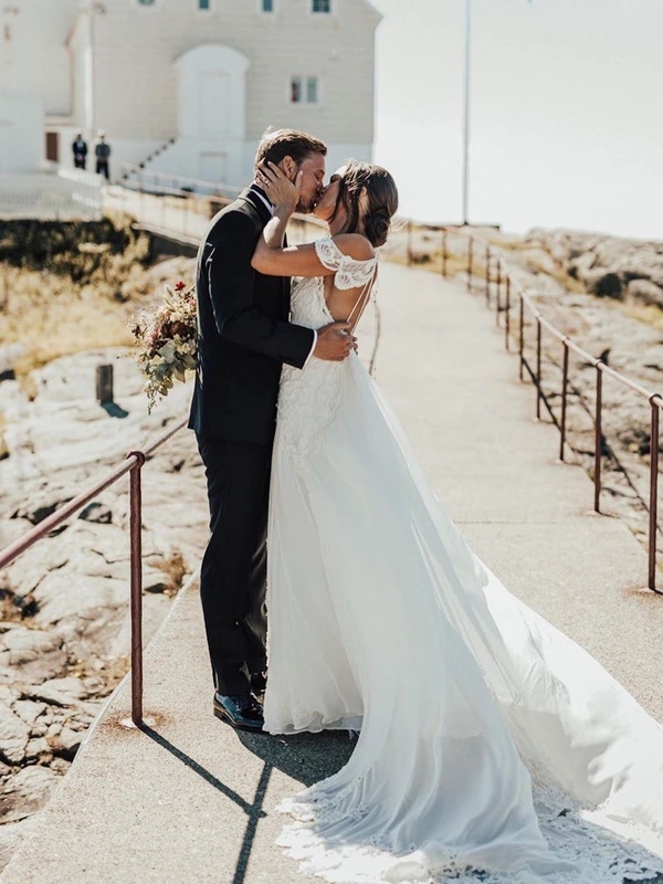 Attractive V-neck A-line Wedding Dresses Appliqued Chapel Train Bridal Gowns