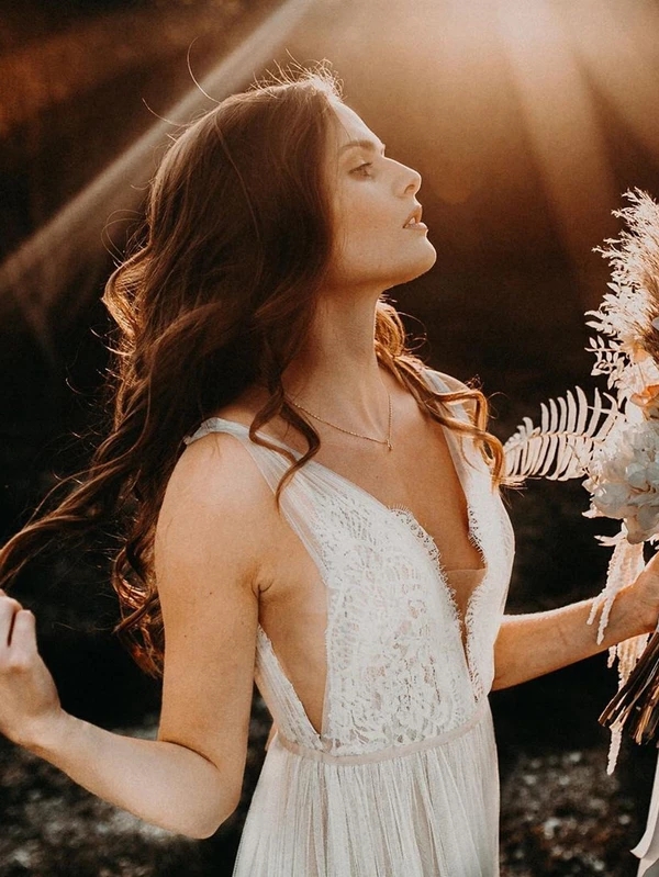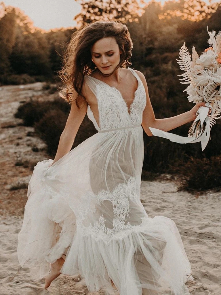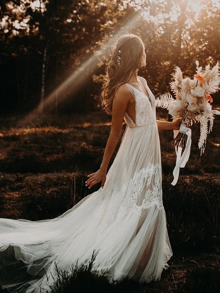 Boho Tulle Illusion V-neck A-line Backless Wedding Gowns
