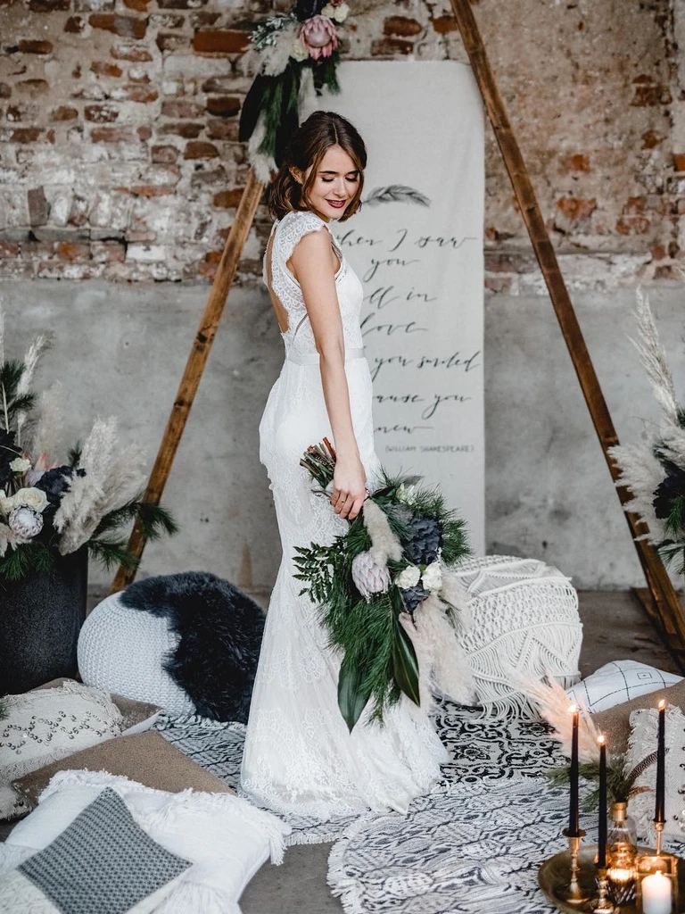 Fabulous Mermaid Lace Backless Sweep Train Wedding Dresses With Cap Sleeves Bridal Gown