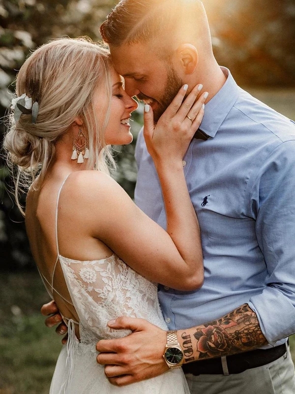 Modest A-Line V Neck Spaghetti Straps Tulle Lace Wedding Dresses with Train