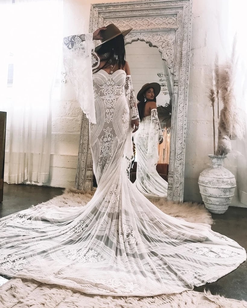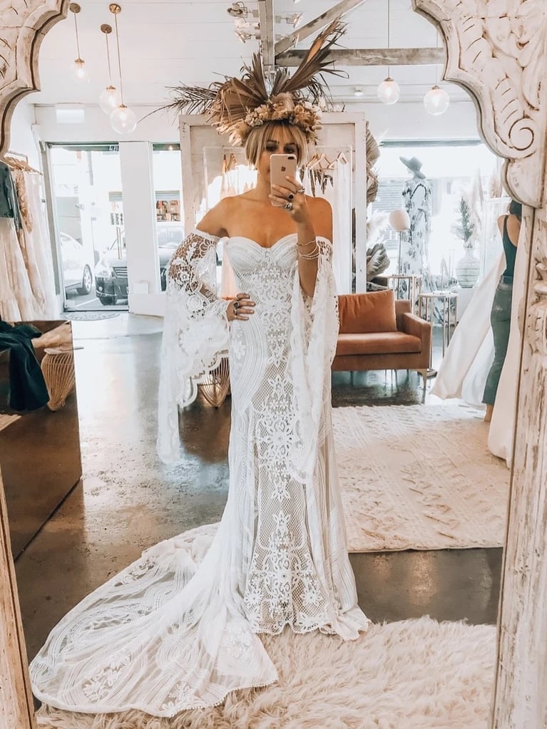 Boho Mermaid Sweetheart Long Sleeve Lace Bohomian Wedding Dresses,Fall Mermaid Bridal Dresses