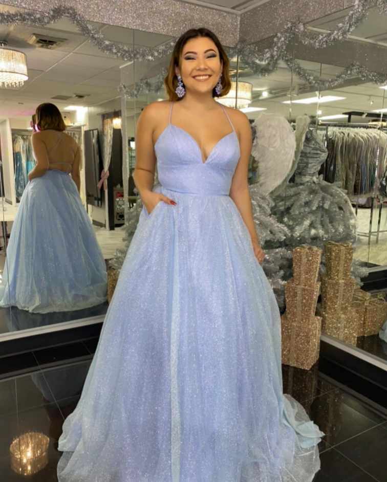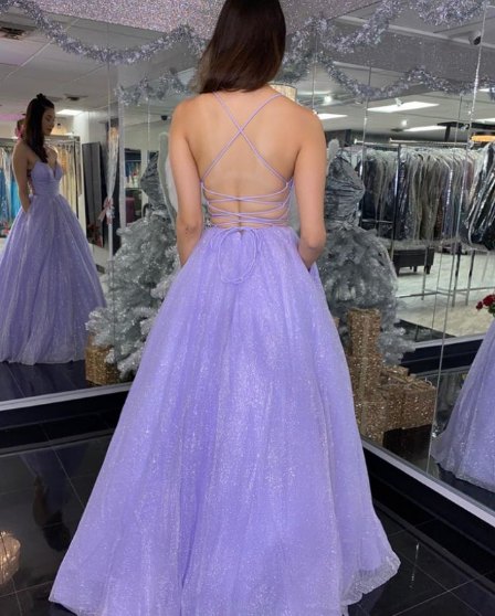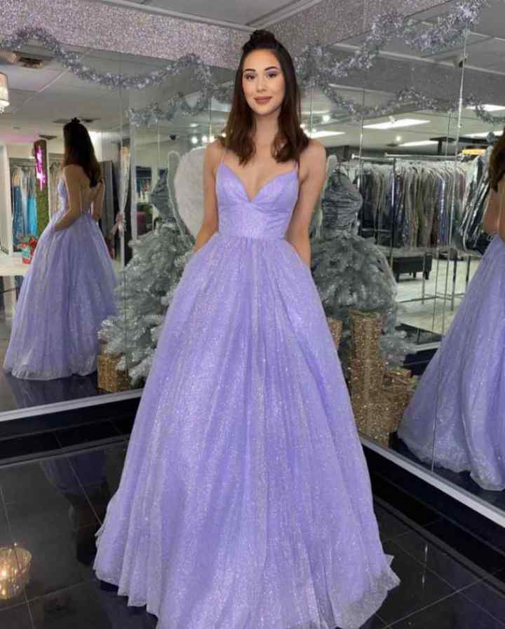 Glitter Spagheti Straps V Neck Lavender Long Prom Dress