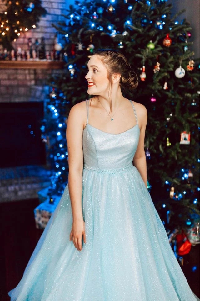 Unique A-Line Scoop Neck Cross Back Sky Blue Sparkly Prom Dresses