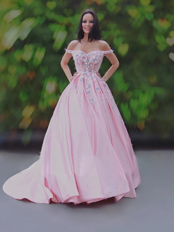A-Line/Princess Satin Applique Off-the-Shoulder Sweep/Brush Train Dresses