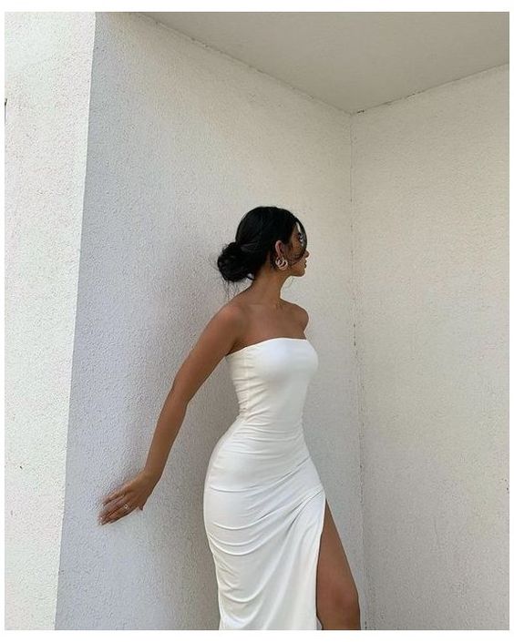Sexy Mermaid Strapless Floor Length White Prom Dresses Evening Dresses with Slit