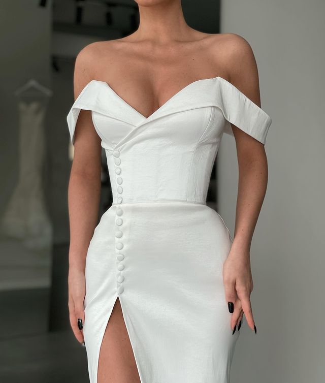 Mermaid Off the Shoulder White Satin Long Prom Dresses with High Slit