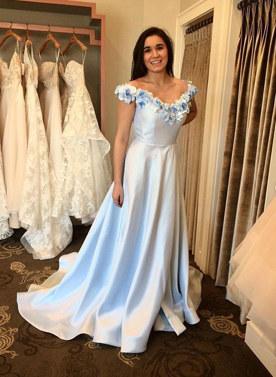Princess A-Line Off the Shoulder Light Blue Satin Long Prom Evening Dresses