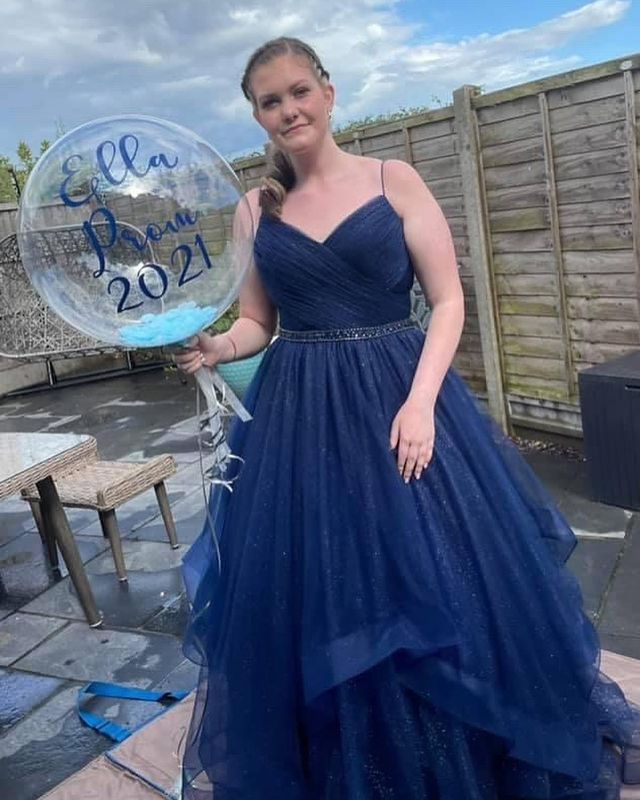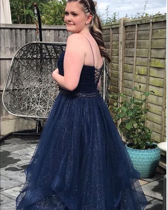 Glitter A-Line V Neck Spaghetti Straps Navy Sparkly Tulle Long Prom Evening Dresses