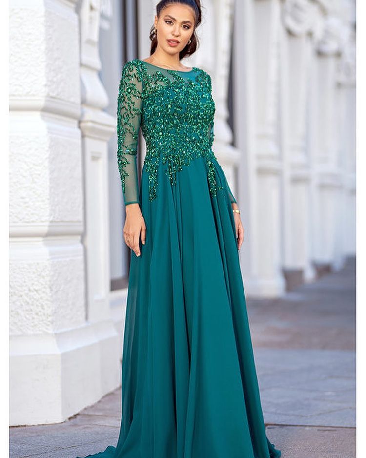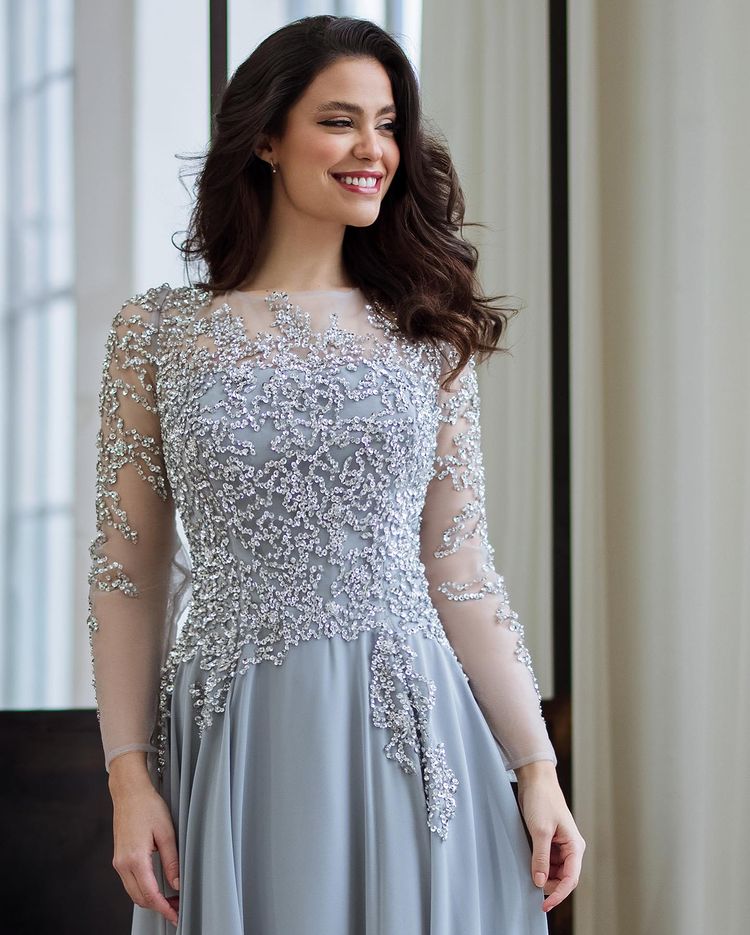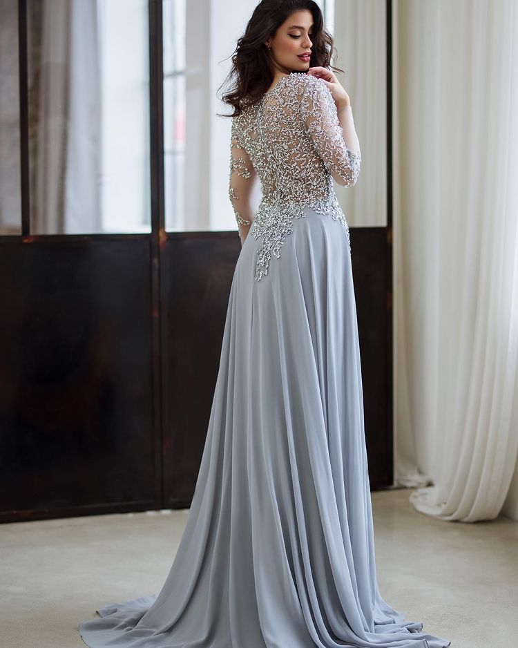 Elegant A-Line Long Sleeve Silver Long Prom Dresses Mother of the Bride Dresses