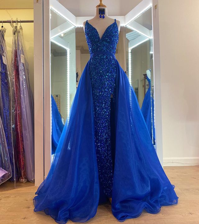 Sparkly Mermaid V Neck Royal Blue Sequins Prom Dress with Detachable Organza Bottom Dress