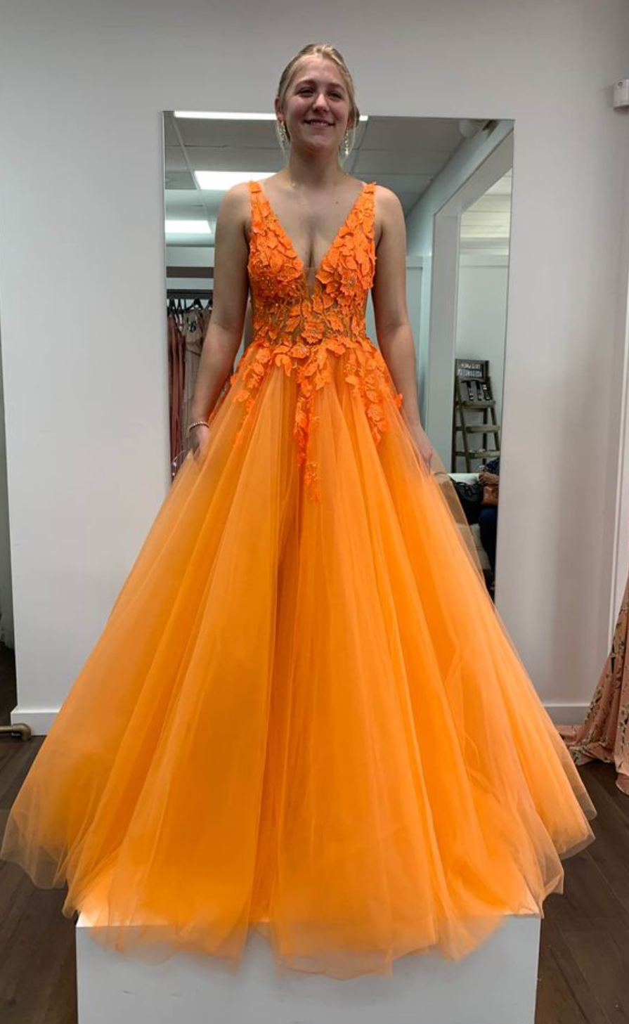 Elegant A-Line V Neck Orange Tulle Long Prom Evening Dresses eith Appliques