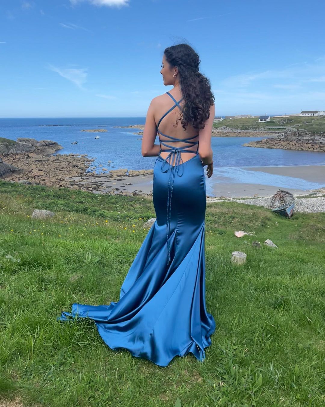Charming Mermaid V Neck Blue Satin Long Prom Dresses