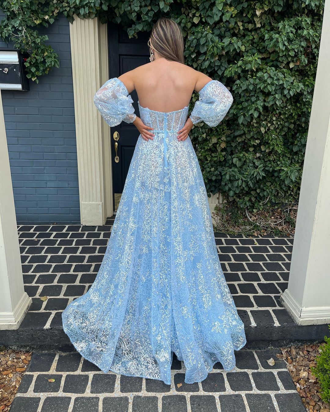 Cute A Line Sweetheart Light Blue Sequins Lace Prom Dresses with Detachable Sleeves