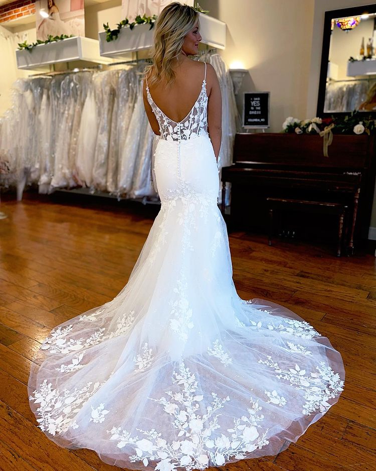 Charming Mermaid V Neck Long Wedding Dresses with Lace