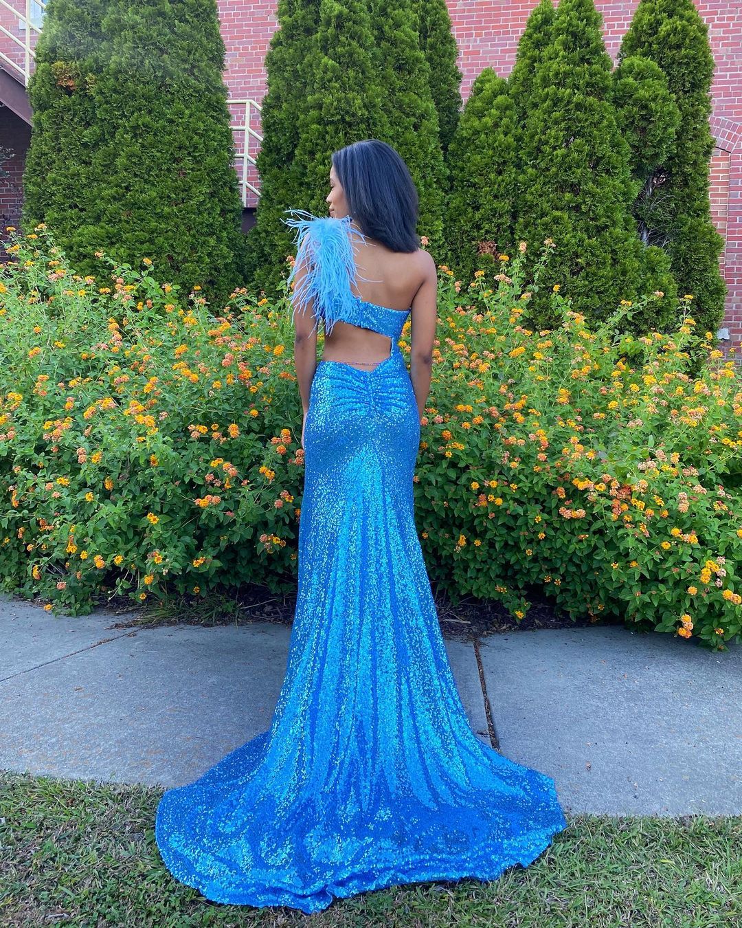 Charming Mermaid One Shoulder Blue Sequins Long Prom Dresses with Slit