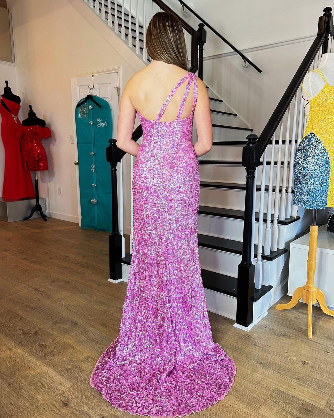 Sparkly Mermaid One Shoulder Pink Sequins Long Prom Dresses with Slit