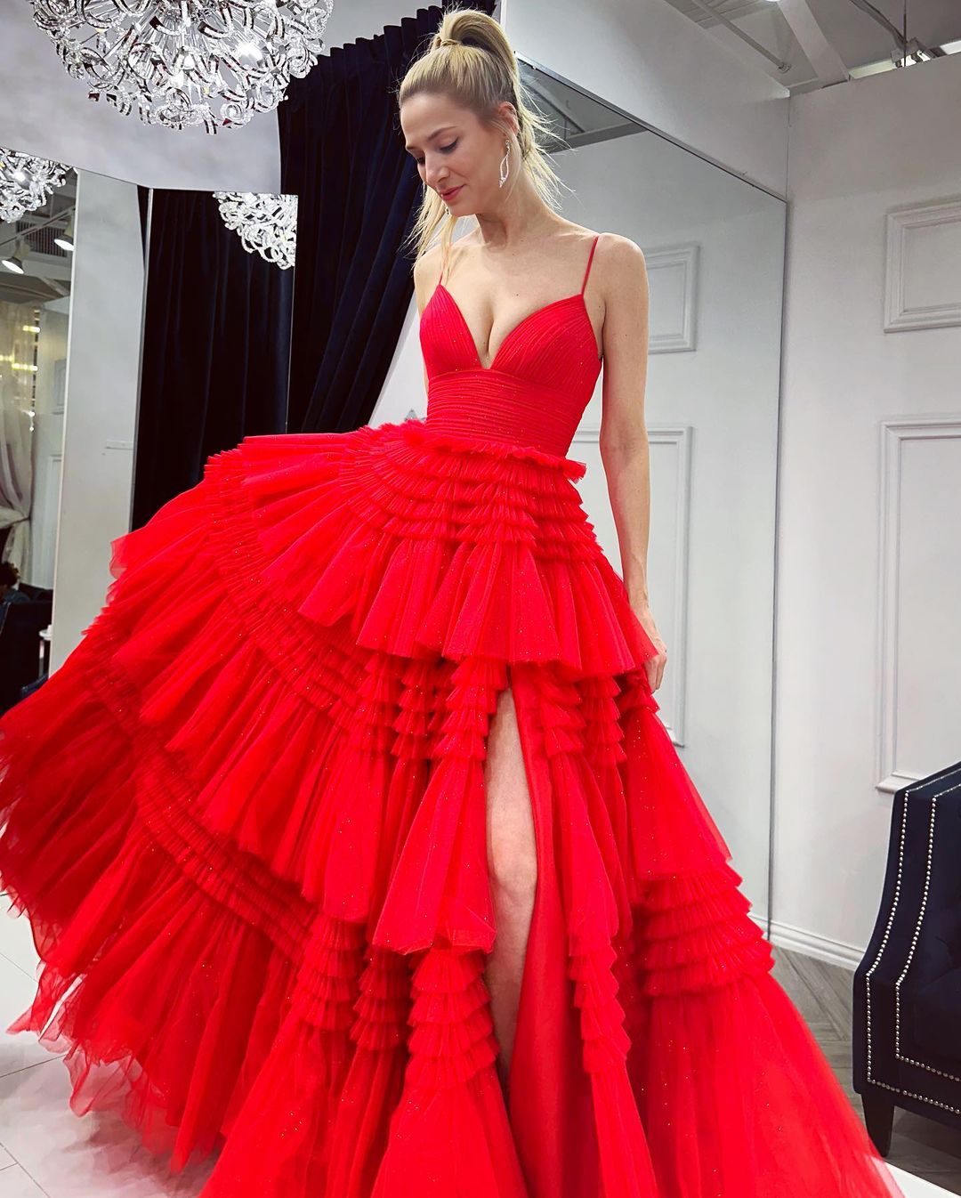 Cute Ball Gown V Neck Pink Tulle Long Prom Dress with Slit