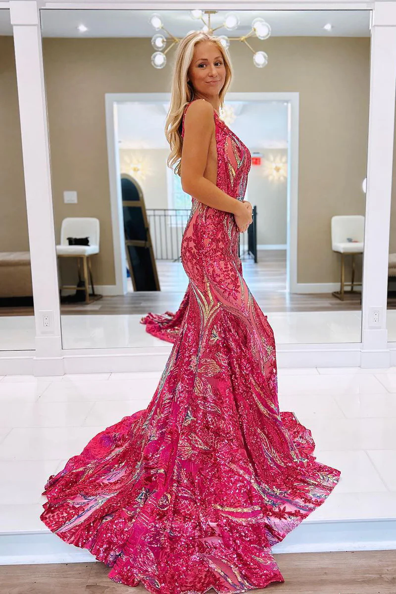 Pretty Fuchsia Sequin Lace V Neck Mermaid Long Prom Dresses VK23120503