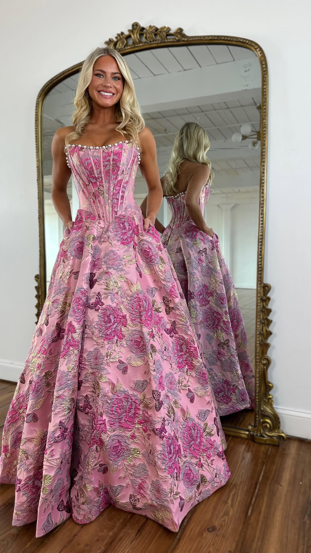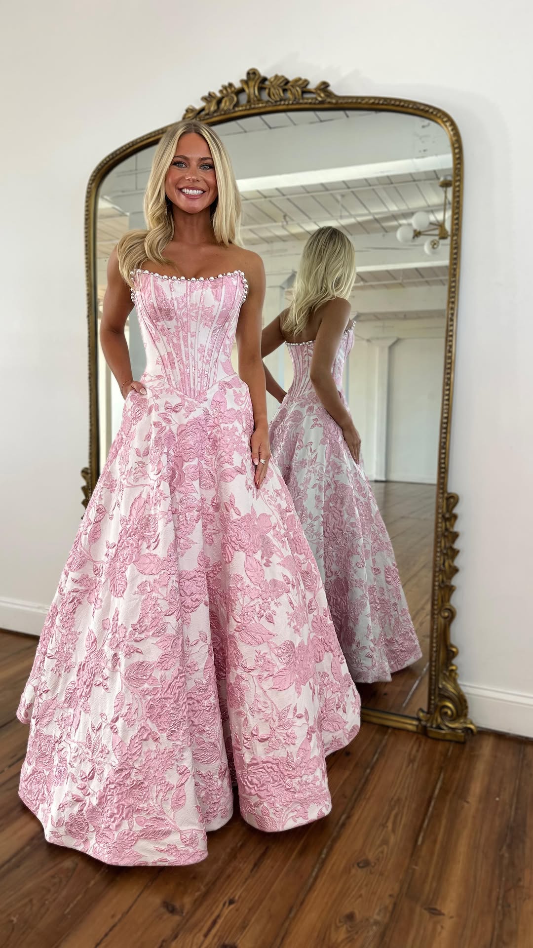 Gorgeous A Line Scoop Neck Jacquard Satin Prom Dress with Pearls VK25121501