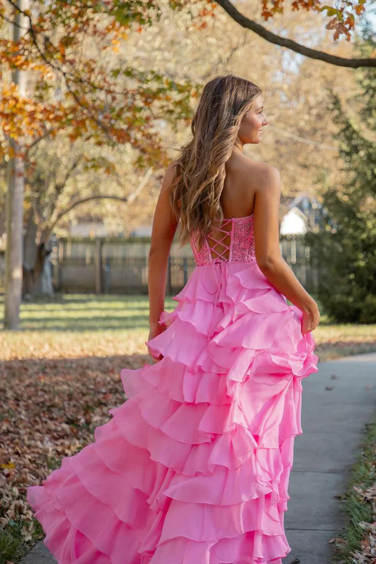 Cute A Line Sweetheart Tiered Chiffon Long Prom Dress with Slit VK25013107
